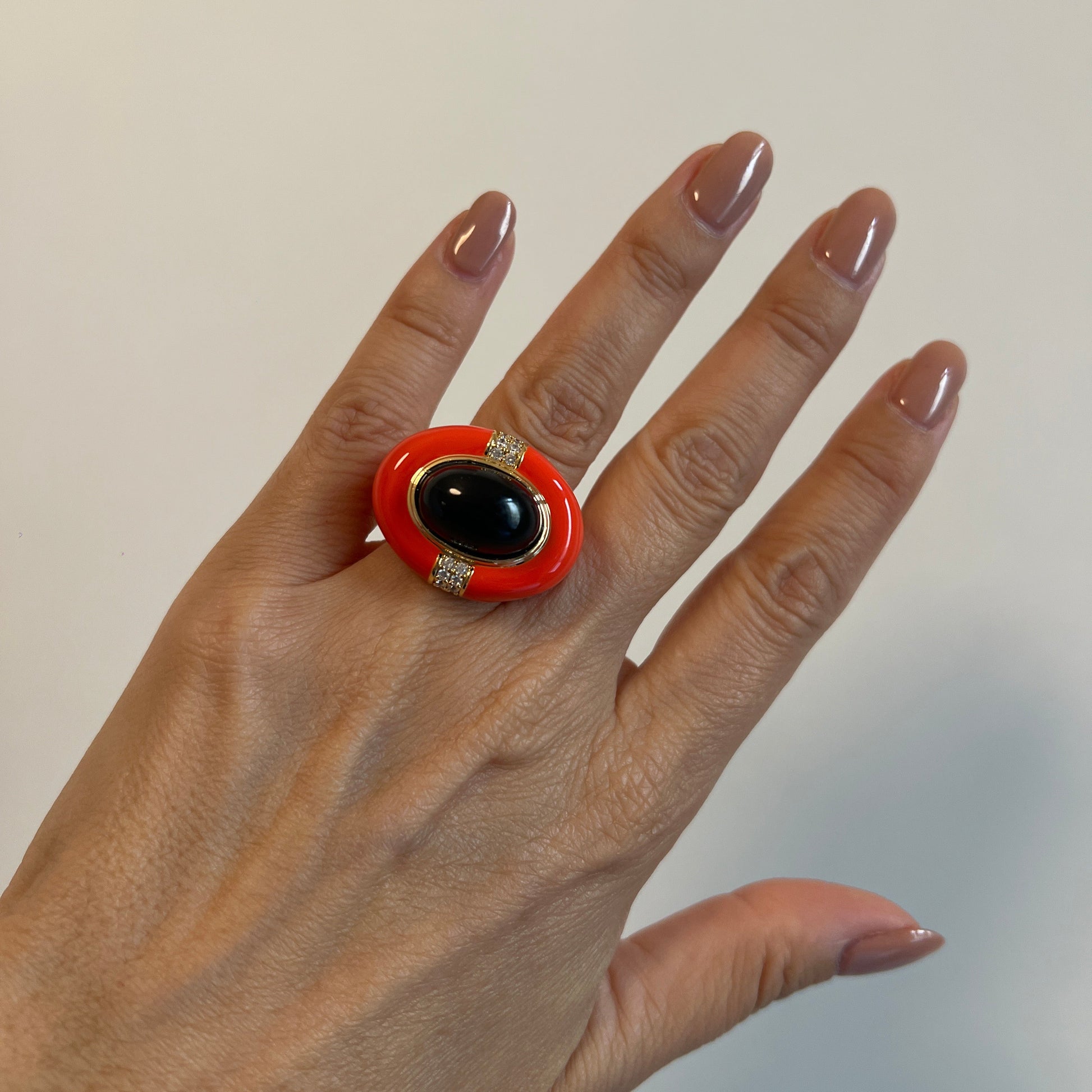 18kt gold plated brass ring with enamel, onyx paste and synthetic imitation ZC A+ Moro&Ognissanti diamond, round brilliant cut.