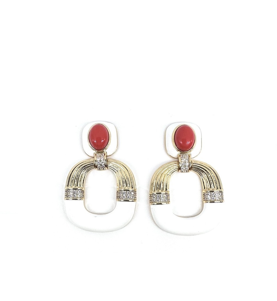 Orecchini in ottone placcato in oro 18 kt , smalti e pasta di corallo con imitazioni sintetiche del diamante ZC A+ Moro&Ognissanti taglio brillante round.
