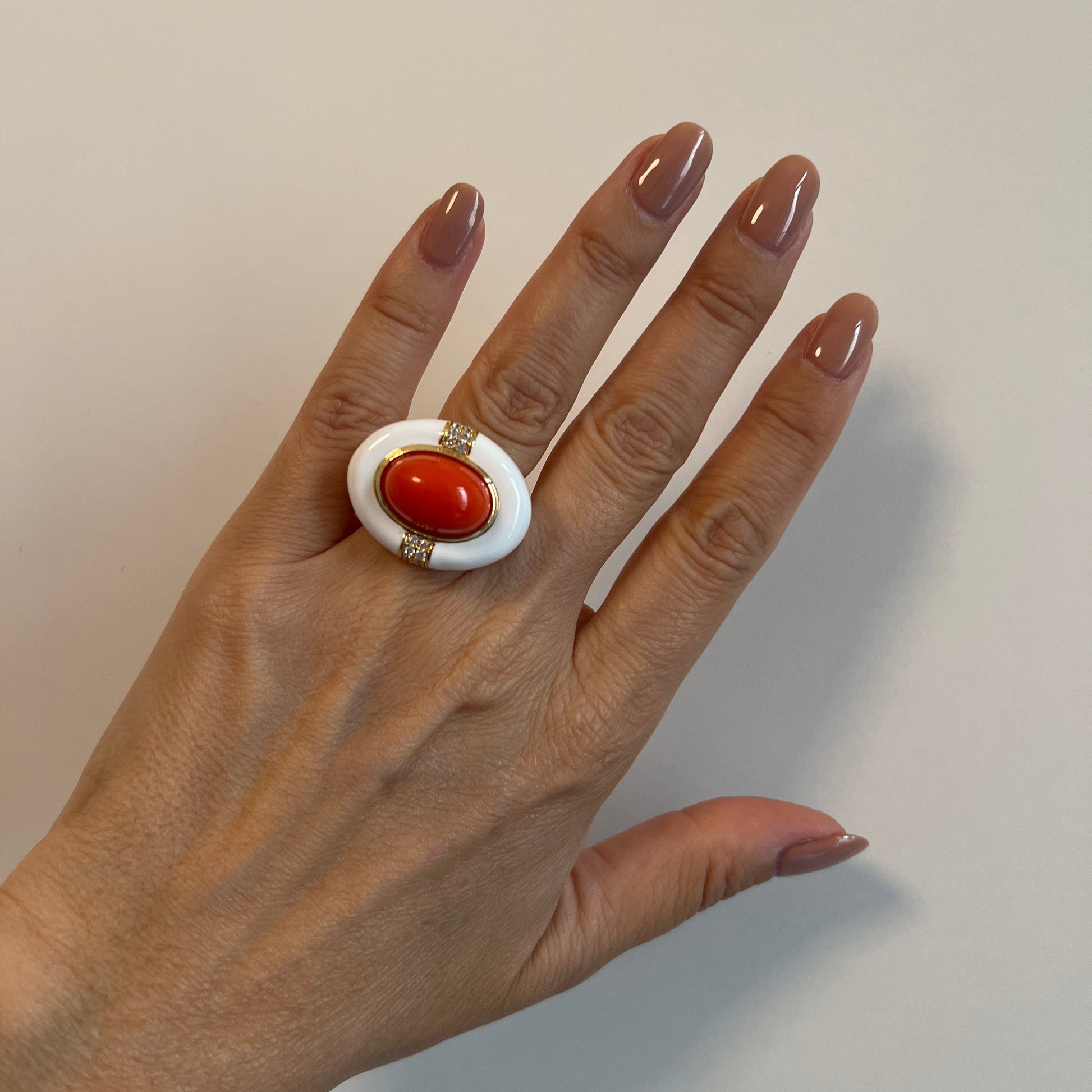 Anello in ottone placcato oro 18 kt con smalti, pasta di corallo e imitazioni sintetiche del diamante ZC A+ Moro&Ognissanti, taglio brillante round.